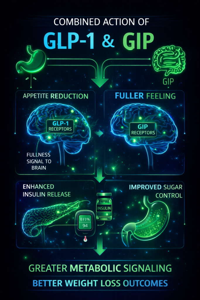 2) Tirzepatide — Dual Hormone Action (GLP-1 + GIP)