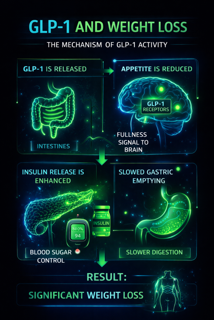 - GLP-1 is a hormone secreted after eating that stimulates insulin release, slows gastric emptying, and promotes feelings of satiety.