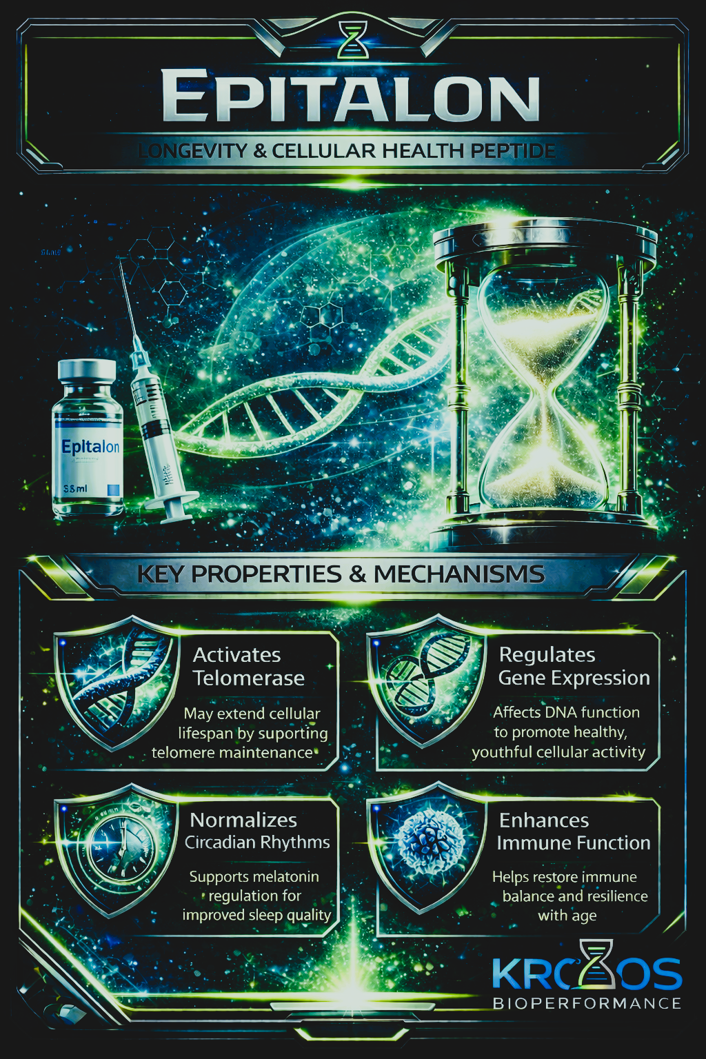 Epitalon is best known for its potential role in longevity support, cellular aging regulation, and circadian rhythm normalization. It has been studied for its ability to: