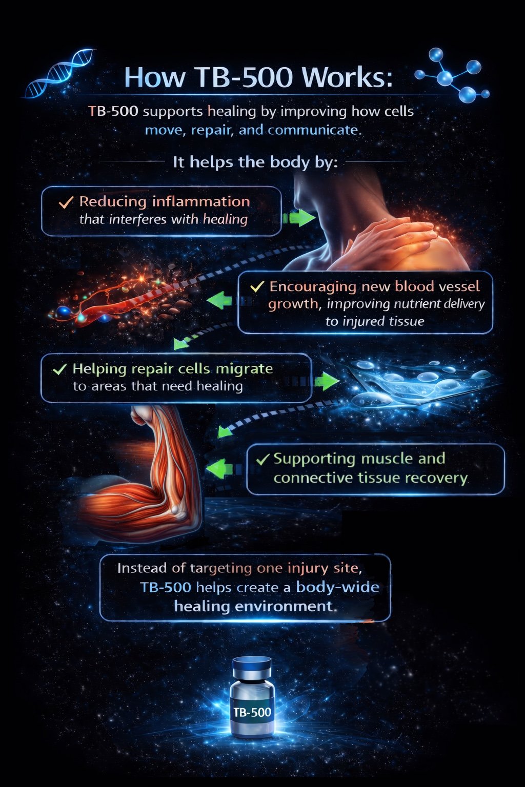 TB-500 is best known for its role in musculoskeletal repair, injury recovery, and tissue regeneration. It has been studied for its ability to: